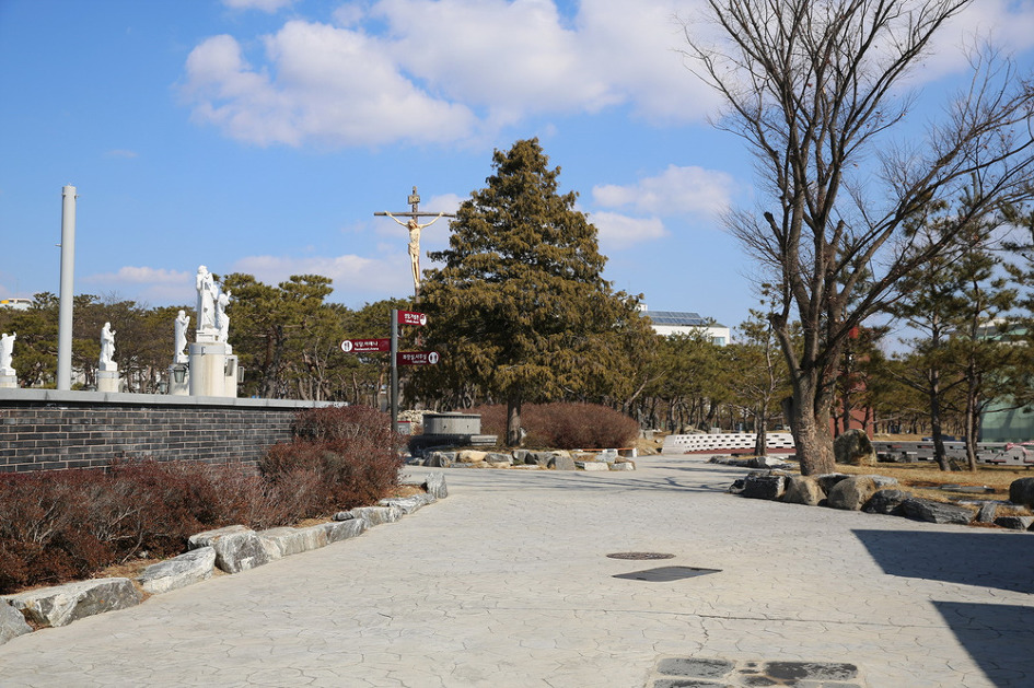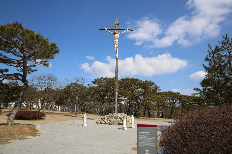 고요한 가운데 이곳을 오가는 몇명의 사람들만이 눈에 띄입니다. 이정표와 함께 솔뫼성지를 오면 가장 먼저 맞아주는 십자가에 매달린 예수상입니다.