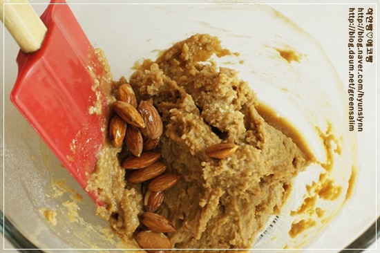 주걱으로 칼로 자르듯이 섞다가 2/3쯤 섞이면 통아몬드를 넣고 반죽을 마무리해요.