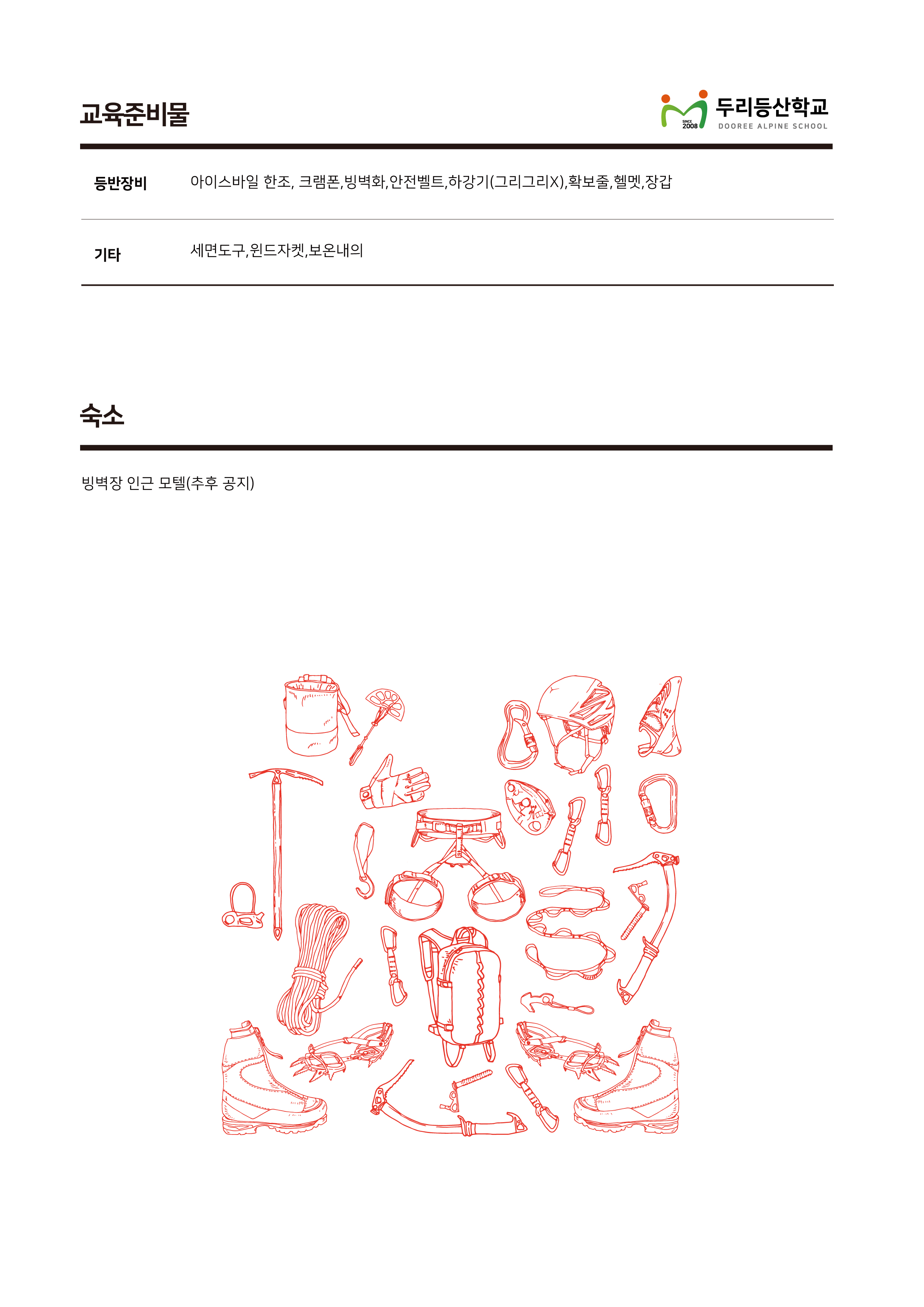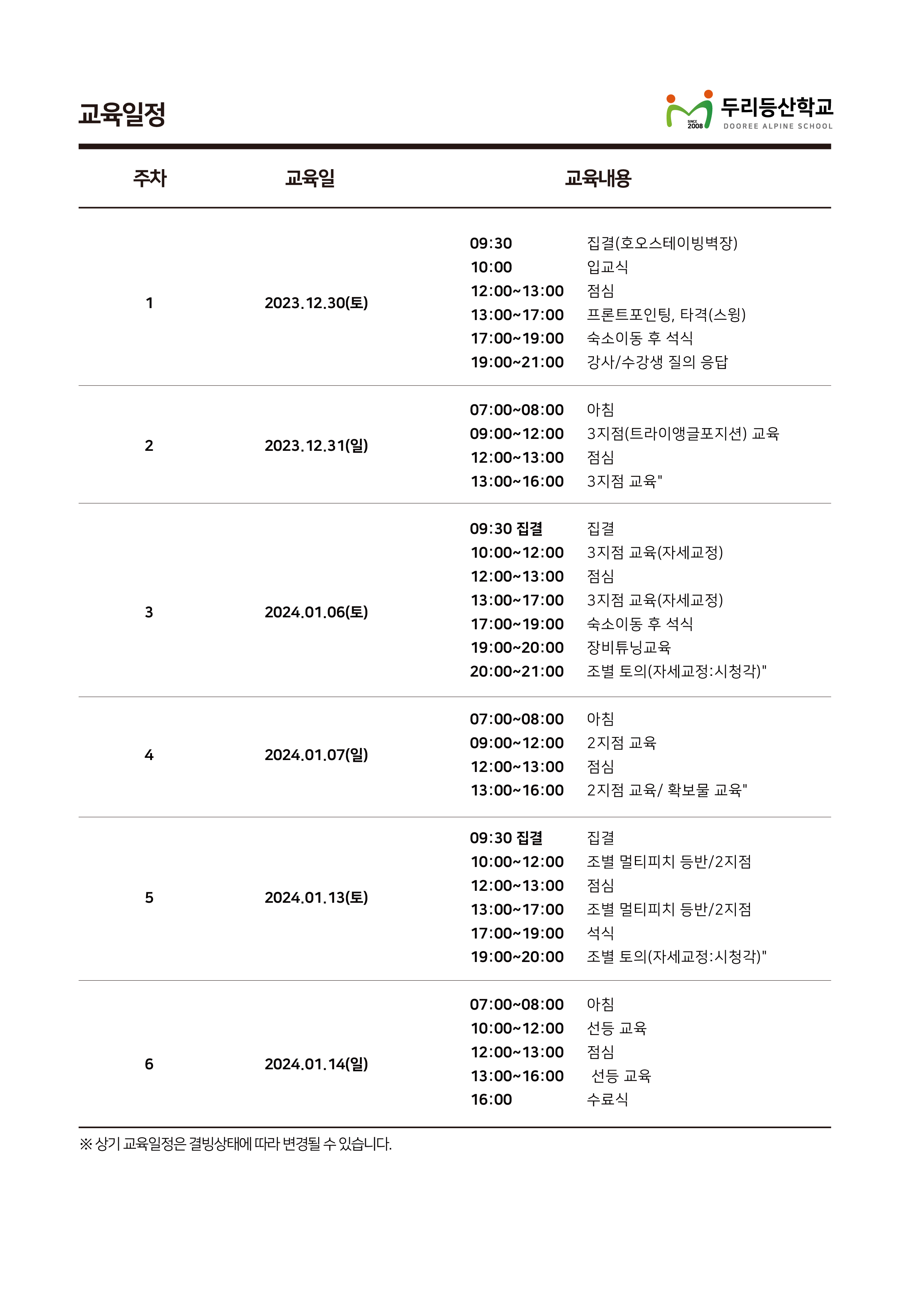 첨부파일: 두리등산학교 동계반 교육일정pdf를 다운로드 하실 수 있습니다.