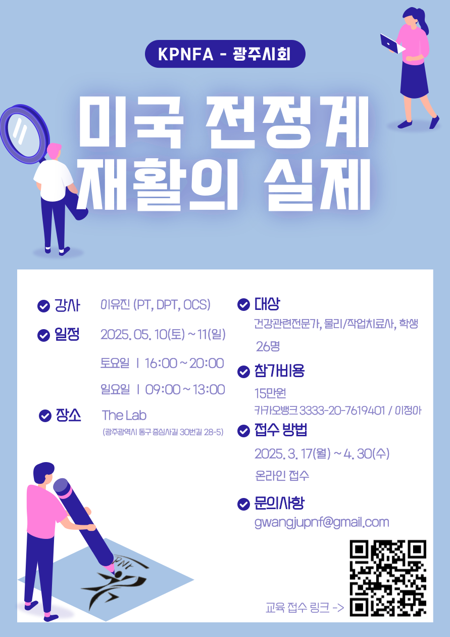 • 문 의 : 교육학술팀 혹은 gwangjupnf@gmail.com 혹은 광주시회 인스타그램(@pnf_gwangju) DM