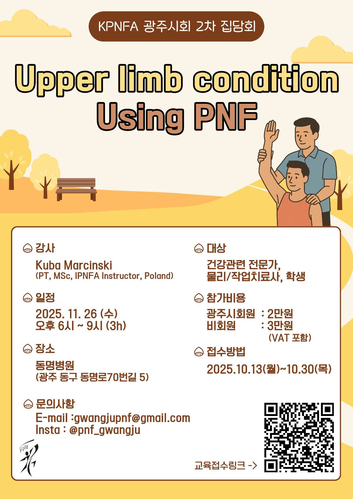 • 문 의 : 교육학술연구팀 gwangjupnf@gmail.com 혹은 광주시회 인스타그램 (@pnf_gwangju) DM