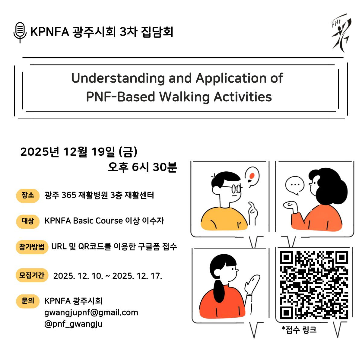 • 문 의 : 교육학술연구팀 gwangjupnf@gmail.com 혹은 광주시회 인스타그램 (@pnf_gwangju) DM