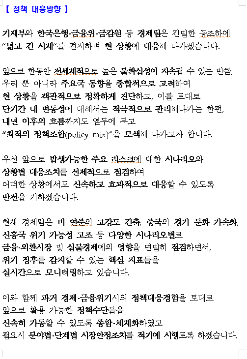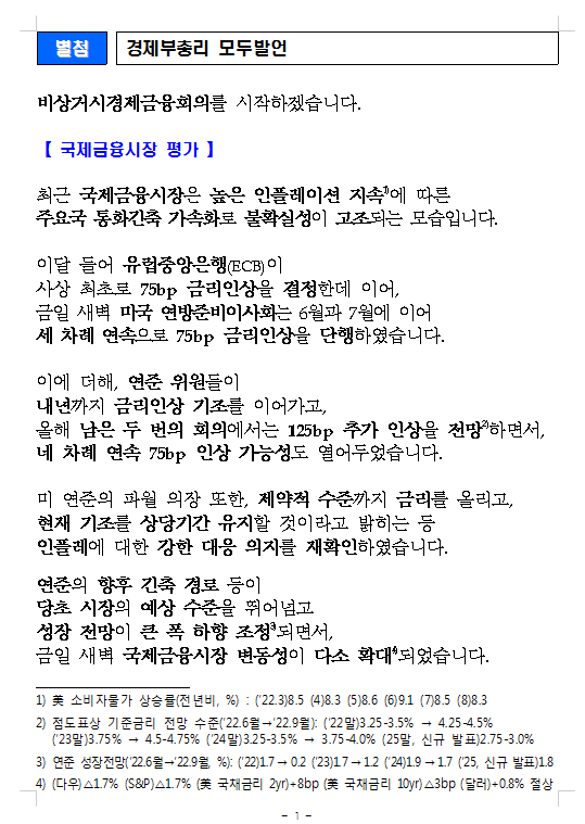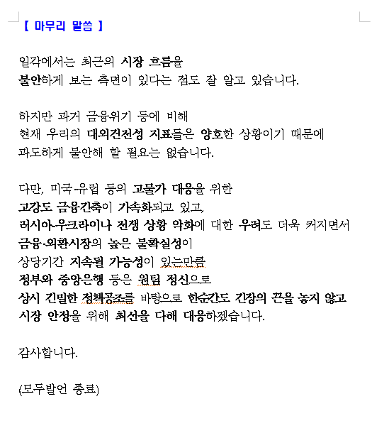비상거시경제금융회의 작성자번개번개|작성시간22.09.22|조회수514 목록 댓글 4 글자크기 작게가 글자크기 크게가 220922 비상거금 보도자료 ★.hwp228.50KB 첨부파일첨부된 파일이 6개 있습니다. etc 파일 1.PNG 다운로드 etc 파일 2.PNG 다운로드 etc 파일 3.PNG 다운로드 etc 파일 4.PNG 다운로드 etc 파일 5.PNG 다운로드 hwp 파일 220922 비상거금 보도자료 ★.hwp 다운로드 다음검색 현재 게시글 추가 기능 열기 북마크 공유하기 신고 센터로 신고 댓글 댓글 4 댓글쓰기 답글쓰기 댓글 리스트 작성자번개번개 작성자 본인 여부 작성자 | 작성시간 22.09.22 위 내용보면 125bp면한번은 0.75 두번째는 0.5로 마무리 히는걸고 보이네요. 삭제된 댓글입니다. 답댓글 작성자번개번개 작성자 본인 여부 작성자 | 작성시간 22.09.22 대충 계산 나오는데요 작성자아탈라 | 작성시간 22.09.22 쓸데없는걸 하고있군주사위 1000개씩 던져야 중간에나 갈건데 댓글 전체보기