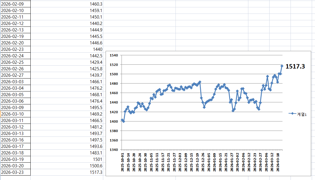 3월 23일 환율 1517.3 원 작성자번개번개|작성시간26.03.23|조회수152 목록 댓글 1 글자크기 작게가 글자크기 크게가 출처 한국은행 다음검색 현재 게시글 추가 기능 열기 북마크 공유하기 신고 센터로 신고 댓글 댓글 1 댓글쓰기 답글쓰기 댓글 리스트 작성자Young01 | 작성시간 26.03.23 인생에 가장 값진 선물은 인연이 아닐까 십습니다 .늘 고맙습니다. 댓글 전체보기