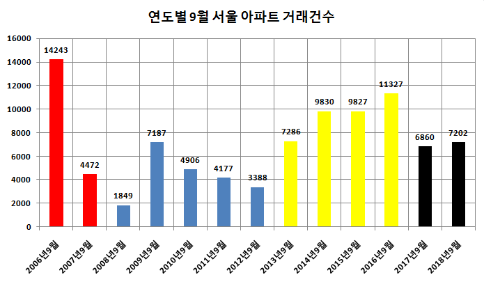 연도별 9월 서울 아파트 거래건수 작성자번개번개|작성시간19.09.01|조회수258 목록 댓글 0 글자크기 작게가 글자크기 크게가 빨간 막대 = 노무현 대통령파란 막대 = 이노란 막대 = 박검정 막대 = 문 다음검색 현재 게시글 추가 기능 열기 북마크 공유하기 신고 센터로 신고 댓글 댓글 0 댓글쓰기 답글쓰기 댓글 리스트