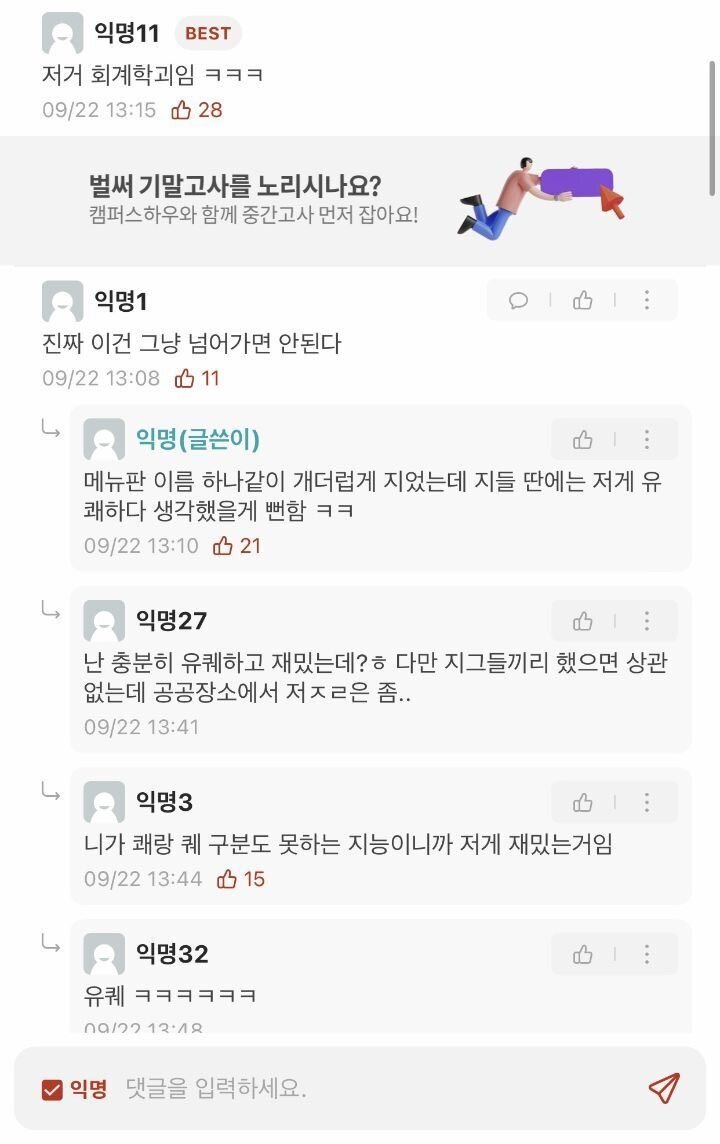 19+a) 요새 애새끼들 왜 이 지랄하는거임? 작성자Full Hexagon|작성시간22.09.23|조회수1,046 목록 댓글 1 글자크기 작게가 글자크기 크게가 회계학과? 매번 말하지만 조올라 멋지다. 진짜 네네는 진심 최고다 다음검색 현재 게시글 추가 기능 열기 북마크 공유하기 신고 센터로 신고 댓글 댓글 1 댓글쓰기 답글쓰기 댓글 리스트 작성자트루킴 | 작성시간 22.09.23 20대초반 혈기왕성나이엔 사리분별이 잘 안될까요? 그래도 대학생인데...황당하군요.하지만 아이러니하게 20-30년 전에도 더했으면 더했지 덜하진 않았던듯 ㅎ 댓글 전체보기