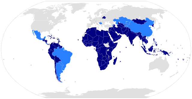 비동맹 운동 회원국. (2012년 기준) 연한 파랑은 참관국 지위.