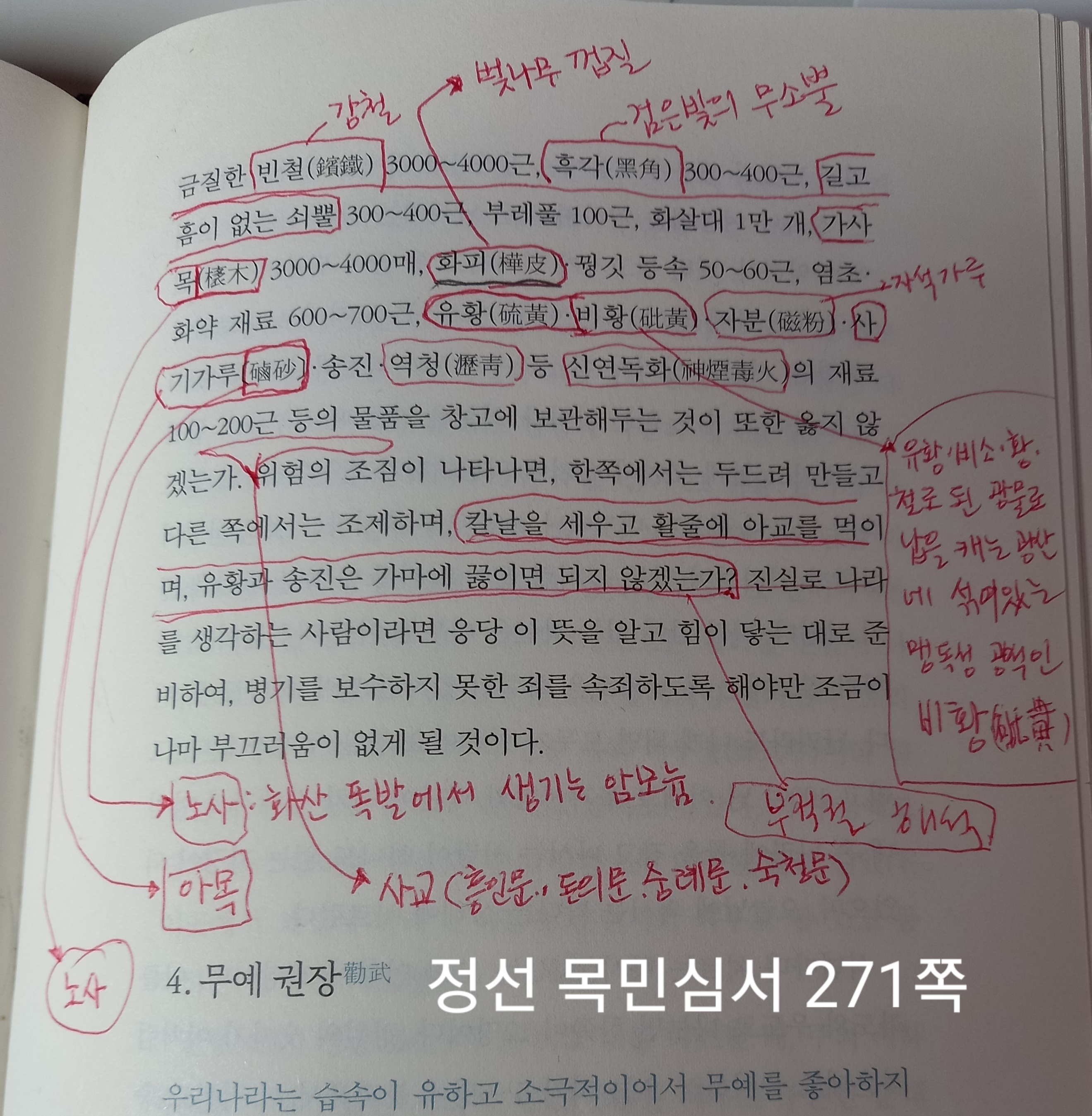 구리 1,000근, 100번쯤 담금질한 검은 강철 3,000~4,000근, 검은빛의 무소뿔 300~400근, 길고 흠이 없는 쇠뿔 300~400근, 부레풀 100근, 화살대 10,000개, 아목(𣘨木 : 원문에 <아목은 속칭 가사목이라 하는데 무슨 나무인지 알 수 없어 이름을 그대로 둔다(俗所云 加斜木不知何木今姑名之)> 라는 설명이 있는데, ‘𣘨’는 대옥편을 찾아보면 사실 ‘가사목(加斜木) 가’가 아니라‘나무 무성할 아(𣘨)’‘나뭇가지 휘청거릴 아(𣘨)’이다. 그러므로 아목은 딱히 무슨 나무가 아니라 휘청거리는 나뭇가지, 즉 회초리나 채찍 용도로 쓰일 만큼 낭창낭창한 나뭇가지로 짐작된다) 3,000~4,000매(枚 : 나무줄기, 채찍), 벚나무 껍질, 꿩의 깃 등 50~60근, 정제하지 않은 염초 등 화약 재료 600~700근, 유황‧비소‧황‧철로 된 광물로 납을 캐는 광산에 섞여 있는 맹독성 광석인 비황(砒黃), 자석 가루(자분磁粉), 노사(硇砂 : 화산 폭발 때 분출되는 염화암모늄 가스가 승화하면서 만들어진 작은 돌멩이), 송진, 역청(瀝靑 : 유전에서 석유가 오랜 시간 휘발하면서 자연적으로 생겨나는데, 유전이 있는 지대에는 석기 시대부터 역청을 사용한 유물이 발굴된다) 등 신연독화(神煙毒火), 즉 연수정 빛깔 독을 내뿜는 신비한 화약을 만들 수 있는 재료 100~200근 등, 이러한 모든 물건을 창고에 간직함이 또한 좋지 않겠는가? 사교(四郊 : 동쪽의 흥인문, 서쪽의 돈의문, 남쪽의 숭례문, 북쪽의 숙청문인 사대문을 뜻함)에 변란이 있게 되면 그 조짐이 먼저 나타나는 법이다. 이때를 당하여 한편으로는 두드려 만들고 한편으로는 섞어 제조하며, 칼날은 새로이 숫돌에 갈고, 활깍지는 새로이 아교에 붙게 하고, 신기롭고 독한 폭약은 새로이 가마에서 끓게 하는 것이 또한 옳지 않겠는가? 진실로 나라를 생각하는 사람이라면 응당 이 뜻을 알아야 한다. 힘자라는 데까지 대비하여 병기를 보수하지 못한 죄를 씻으면 그나마 마음에 부끄러움이 남지 않게 될 것이다.