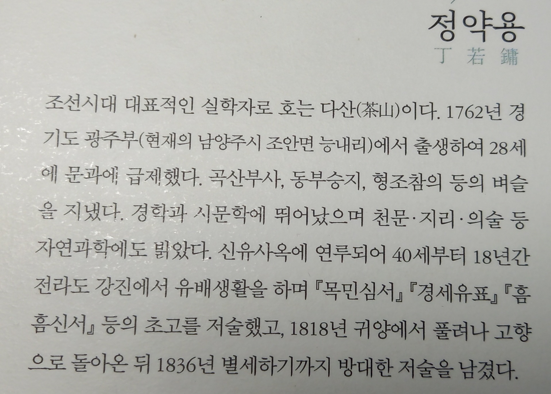 흔히 교과서에서는 정약용을 ‘조선 후기의 실학자’로 표기하지만, 단순히 그를 실학자라는 좁은 틀에만 가둠은 ‘숲은 보면서 나무는 못 보는 경우’와 같습니다. 그는 사실 학문이 매우 깊고 방대하였다고 평가됩니다.