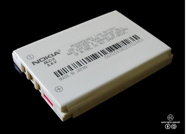 주로 휴대용 전자 제품에서 사용되고 있는 리튬 이온 2차 전지. <출처: (CC)Kristoferb at Wikipedia.org> |