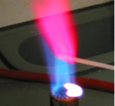 리튬의 불꽃 반응. 진한 붉은색을 띤다. |