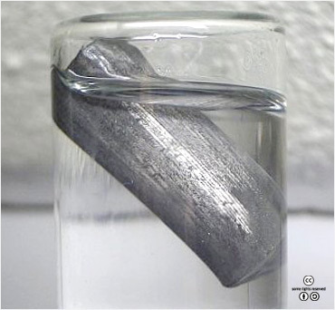기름에 떠 있는 리튬의 모습. 리튬은 금속 원소 중에서 가장 가볍다. <출처: (CC)W.Oelen at Wikipedia.org> |