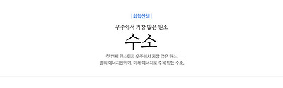 원자번호 1번 원소. 우주에서 가장 풍부한 원소이며, 별, 물, 유기화합물 등에 들어있다. 어원 ‘물(그리스어 hydro)을 생성하는 것(gene)’. 표준원자량 1.008g/mol, 상온에서 무색 무취의 기체, 발견자 캐번디시(H. Cavendish), 녹는점 14K, 끓는점 20K, 주요동위원소 2H(D)와 3H(T), 전자배열 1s1.