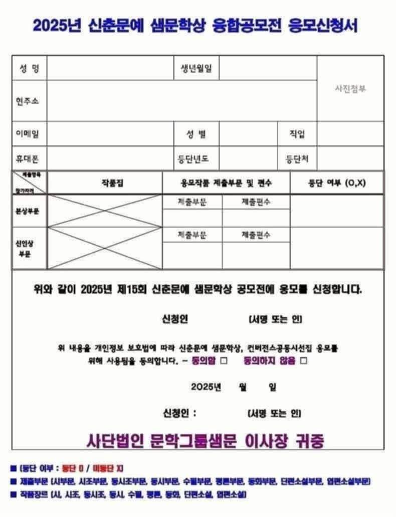 안녕하세요. 2025년 제15회 신춘문예 샘문학상 공모전