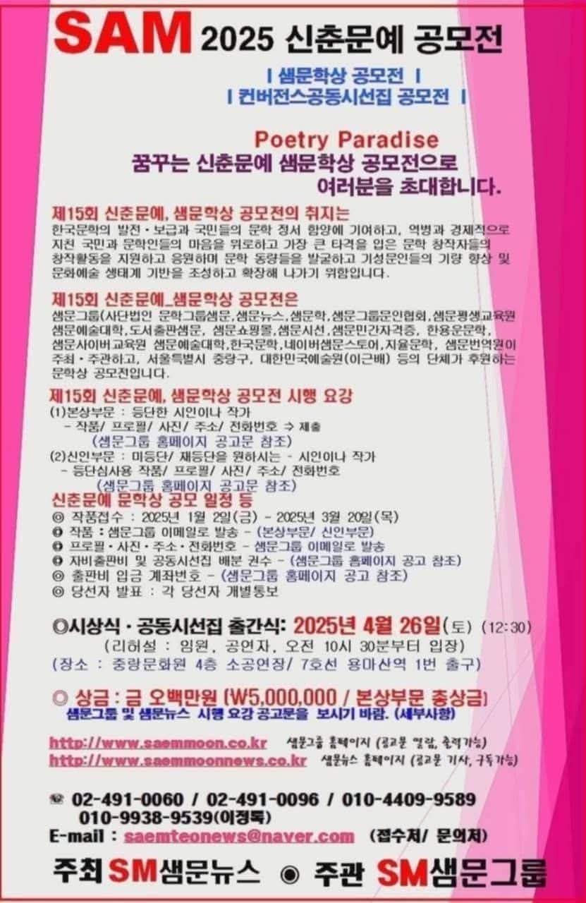 [샘문뉴스]= 2025년 신춘문예 샘문학상 공모전 시행요강 공고 = 총상금 500만원 = SM 샘문그룹 http://m.saemmoonnews.co.kr/1191