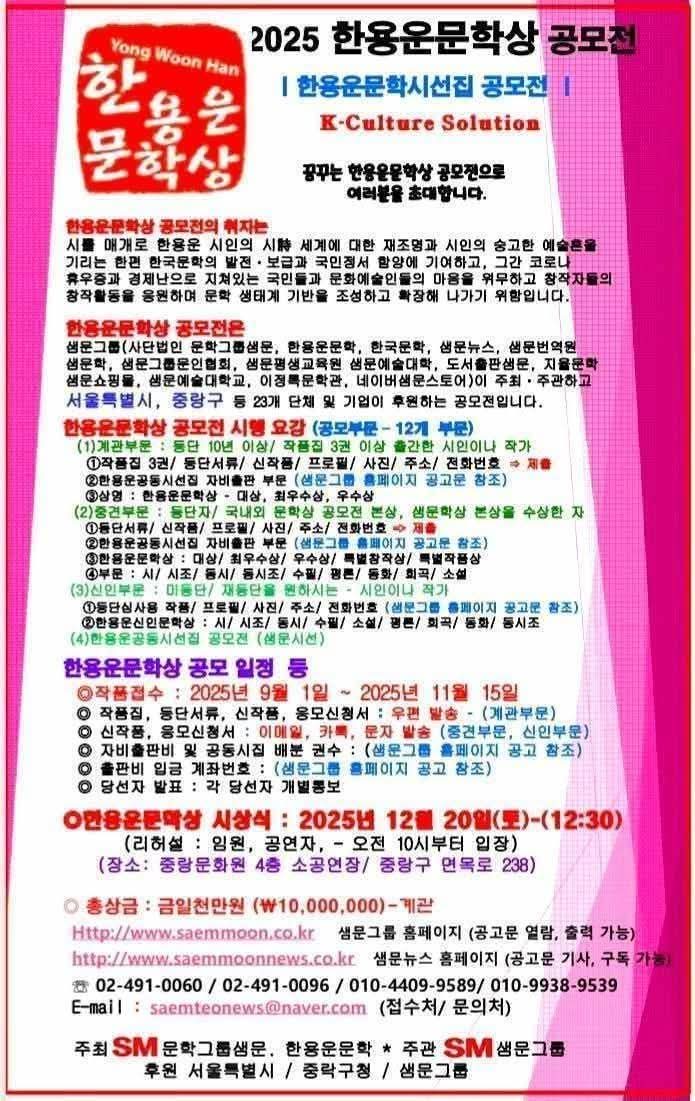 ■2025 한용운문학상 공모전 시행공고■●총상금 1.000만원● 한용운문학, 문학그룹샘문, 샘문그룹 주최/ 서울특별시, 중랑구 후원