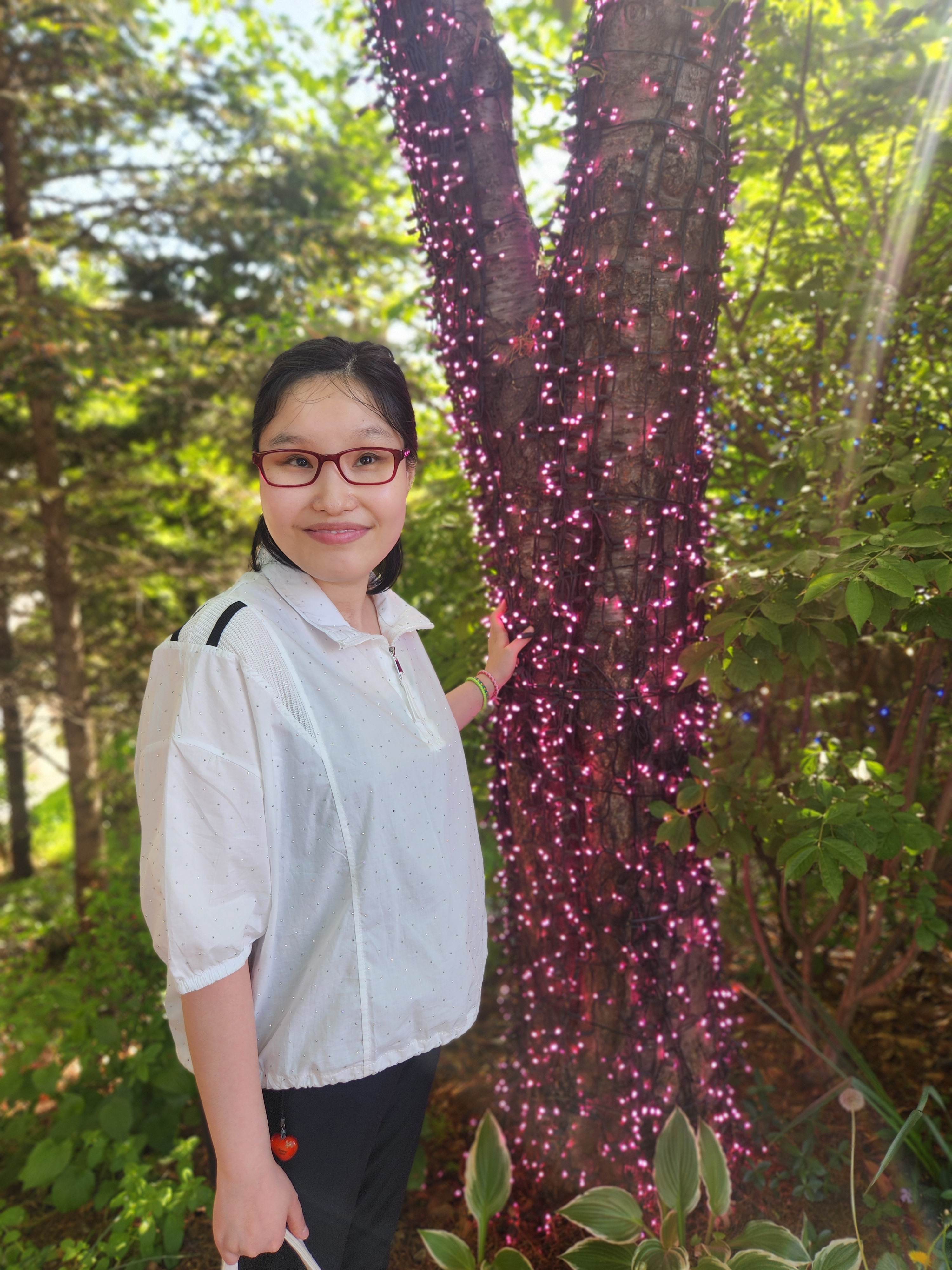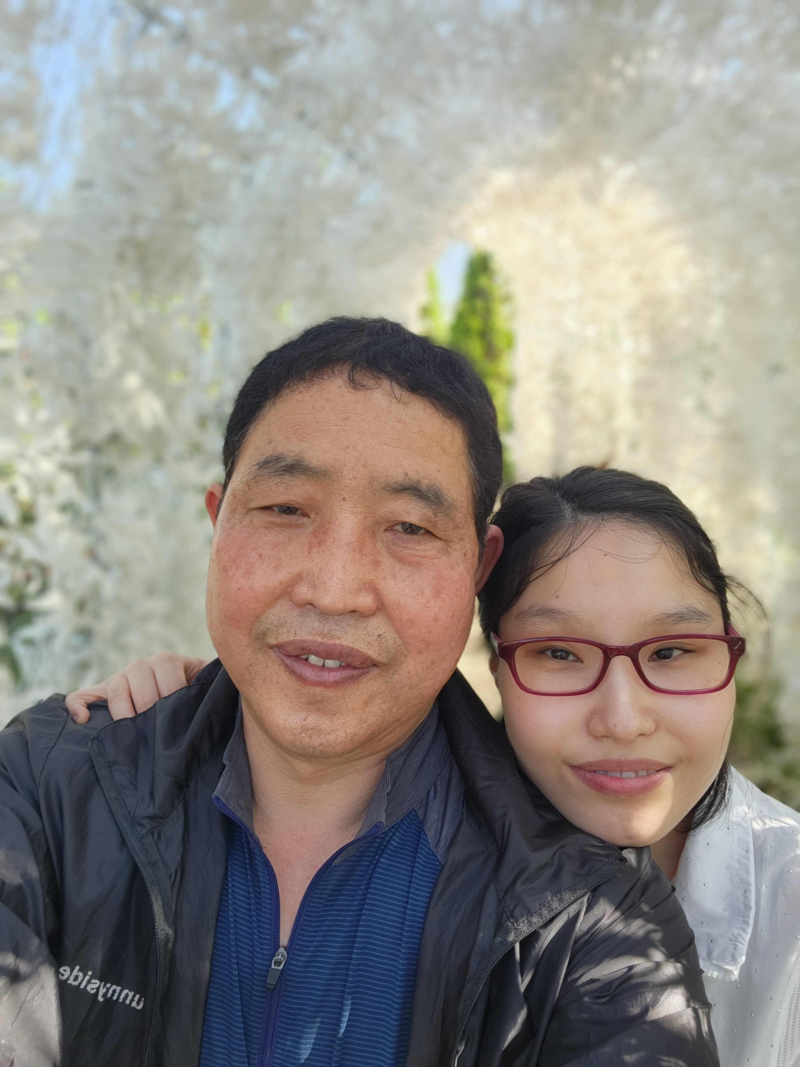 하얀 꽃송이 조명이 달린 터널에서 부녀 사진을 남겼다.