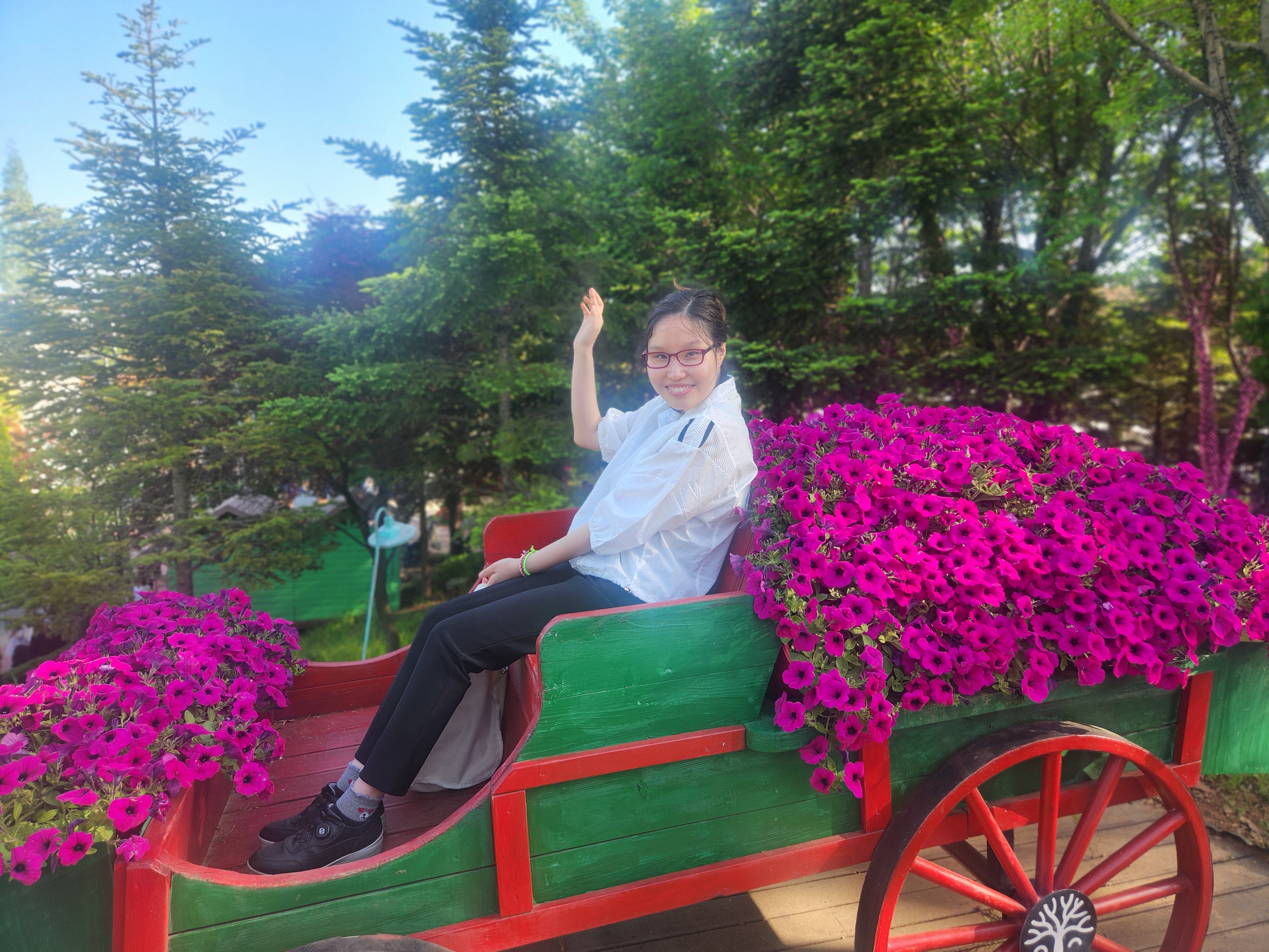히비스커스 계열 꽃으로 장식된 꽃마차에서도 추억을 쌓고