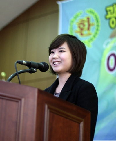 오전 10시 세명컴퓨터고 대강당은 이슬아 초단을 기다리는 후배들의 열기로 후끈 달아올라있었다. 이슬아 초단이 무대에 오르자 강당은 후배들의 환호하는 함성으로 가득찼다.