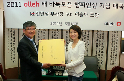 ▲ 5월 18일기념대국에서 이슬아가 전인성 kt부사장에게 본인의 사인이 들어간 바둑판을 증정하고 있다.