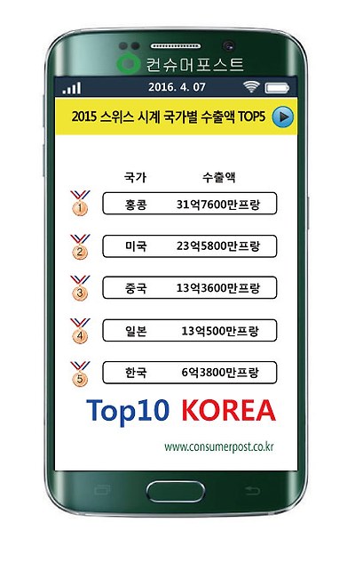 2015년도 스위스 시계 국가별 수출액 TOP5를 공개했다.(스위스시계산업협회) 홍콩에 31억7600만프랑을 수출해 1위에 올랐고, 이어, 미국 23억5800만프랑, 중국 13억3600만프랑, 일본 13억500만프랑, 한국 6억3800만프랑 순으로 높은 수출액을 기록했다.