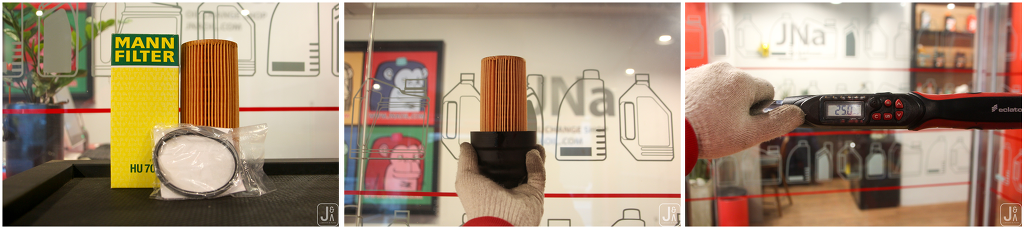 엔진오일 필터는 엔진의 우측 상단에 위치하고 있습니다. 엔진오일 필터는 카트리지 타입으로 MANN 제품을 사용하였습니다. 동봉된 고무 오링과 엔진오일 필터를 교환하고, 토크렌치를 이용하여 필터 케이스를 조입니다. 엔진오일 필터 케이스의 규정 토크는 25N·m입니다.