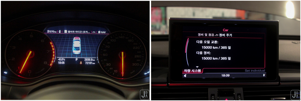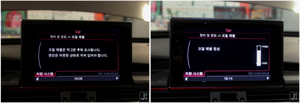 아우디 차량의 경우 별도의 딥스틱이 없고 전자식 센서로 되어 있기 때문에 내부 MMI에서 엔진오일양 측정이 가능합니다. 시동을 걸어 일정 시간 예열 후 오일 레벨 창에서 시동을 끄고 키온 상태로 약 2분간 대기하면 엔진오일 레벨을 체크할 수 있습니다.