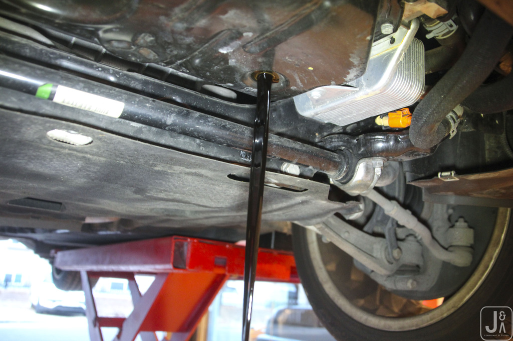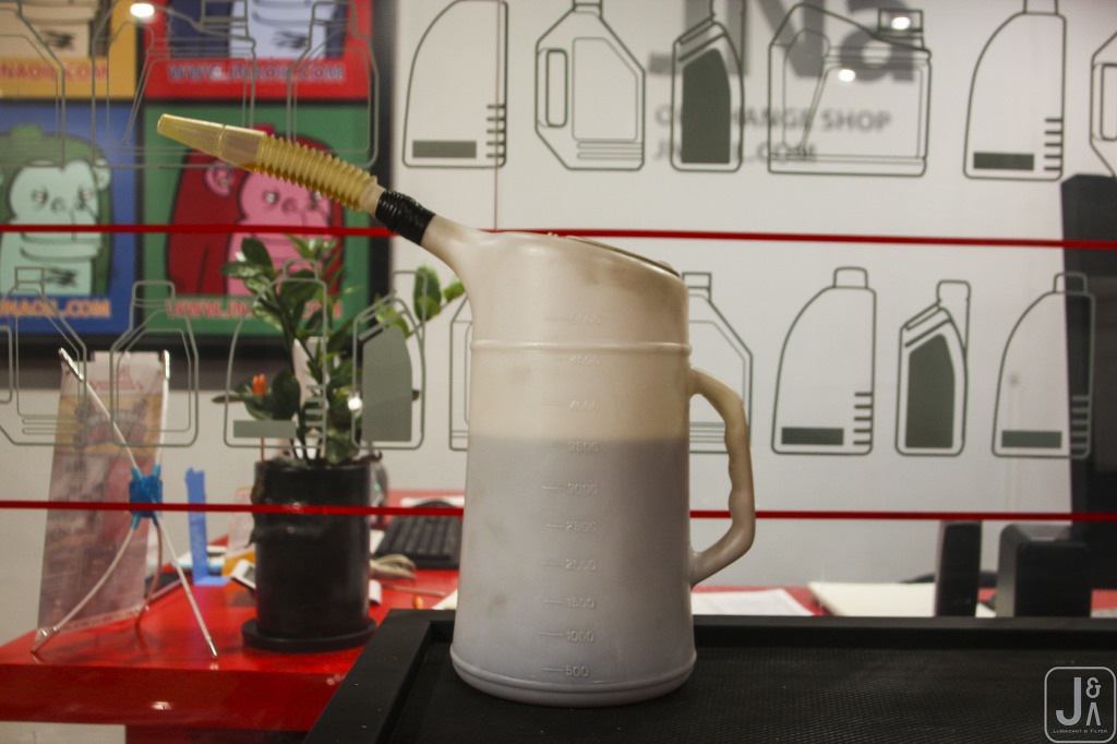 드레인 플러그를 탈거하여 엔진오일을 드레인 합니다. 엔진오일 드레인은 자유낙하 방식으로 천천히 오랜 시간 동안 빠지게 합니다. 배출구가 바닥면에 수직으로 뚫려 있기 때문에 별도의 석션 작업이 필요하지 않습니다.