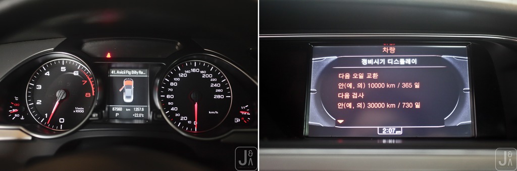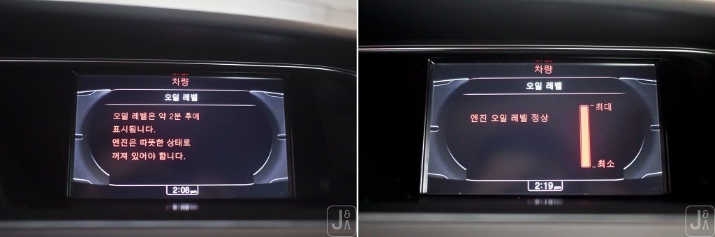 엔진오일 주입 및 서비스 주기 초기화를 하고 난 후 시동을 켠 채로 엔진 온도를 정상 온도까지 올린 다음 시동을 끄고 Key on 상태에서 약 2분 후 측정이 됩니다. 측정은 센터패시아에 있는 MMI 시스템을 통해 확인이 가능합니다.