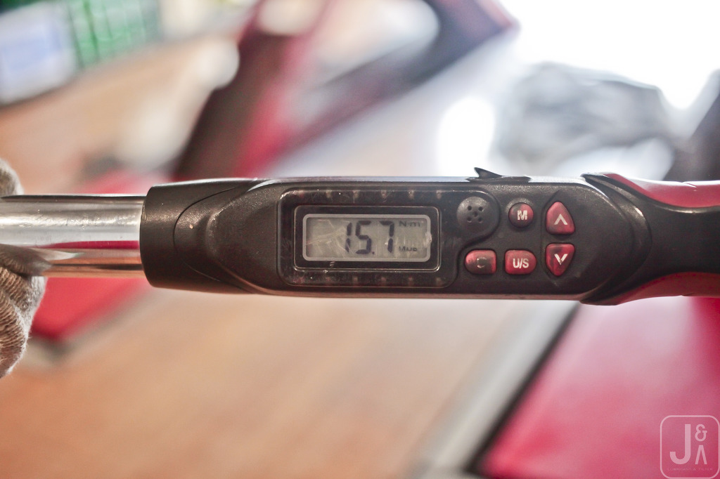 오일필터를 토크 랜치를 이용하여 규정 토크로 체결합니다. 엔진오일 필터의 규정 토크는 15.7N·m입니다.