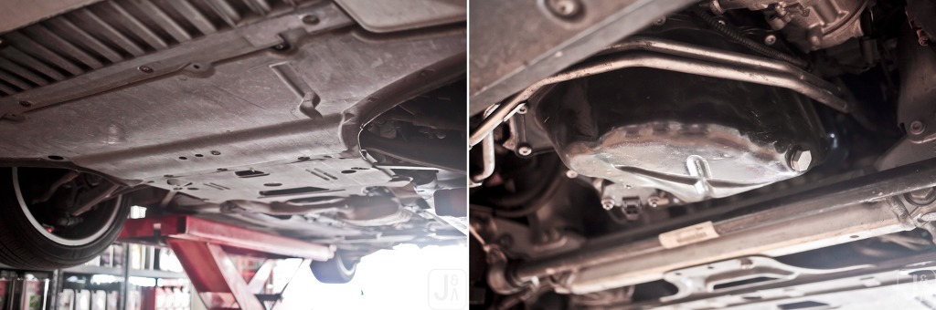 엔진오일 배출을 위해 차량을 리프트 업합니다. 하부에는 플라스틱 타입의 언더 커버가 가오리 같은 모양으로 자리 잡고 있습니다. + 드라이버를 이용하여 언더 커버 볼트를 제거하고 탈거합니다. 언더 커버를 탈거하면 우측 사진과 같이 바닥에 X 모양으로 움푹 들어간 오일 팬이 보입니다.