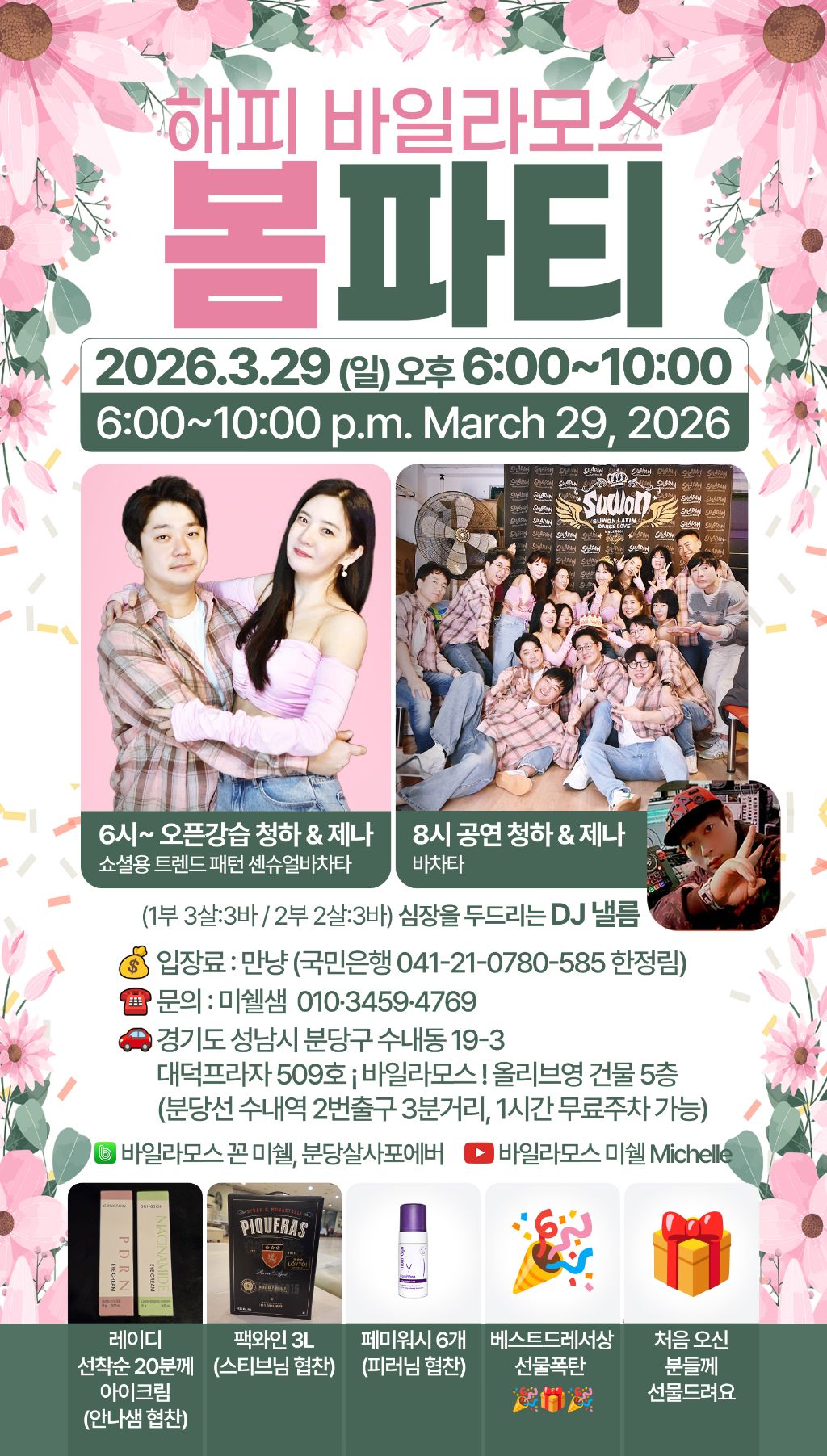 [분당/수내] 3/29(일) 6시~ 봄파티🌼🌸🌼 분당의 핫플레이스 바일라모스에서 만나요🎵🎶 작성자미쉘|작성시간26.03.28|조회수8 목록 댓글 0 글자크기 작게가 글자크기 크게가 다음검색 현재 게시글 추가 기능 열기 북마크 공유하기 신고 센터로 신고 댓글 댓글 0 댓글쓰기 답글쓰기 댓글 리스트