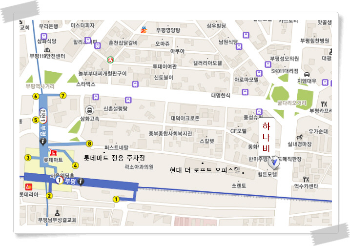 | 지하철 이용시 - 인천 지하철 8번 출구, 1호선 부평역 북광장 출구(개찰구로 바로 나와서 오른편 화장실,약국 있는쪽) 출구로 나오셔서 바로 오른편으로 보시면 귀금속 도매센터 건물과 롯데마트 전용 주차장이 보입니다. 그 사잇길 3~4분정도 직진 하시면 오른편에 현대로프트 오피스텔과 길 왼쪽편 힐튼 모텔이 있습니다. 저희 하나비는 힐튼 모텔 옆건물 2층입니다. 하나비 간판은 크게 써있지 않고 1층에 '카오디오'라는 큰 간판이 있는 건물 2층으로 오시면 됩니다. 자가용 이용시 - 부평역 굴다리 오거리 부천, 서울 방향으로 길 오른편에 바로 1층 카오디오 간판 건물 2층에 있습니다. - 한국 마사회 부평 지점 길 건너편 1층 카오디오 간판 건물 2층에 있습니다. 버스 이용시 - 부천 지역 88번 G버스 굴다리 오거리에서 하차 1분거리 http://cafe.daum.net/clubhanabi ☏032-519-9895 |