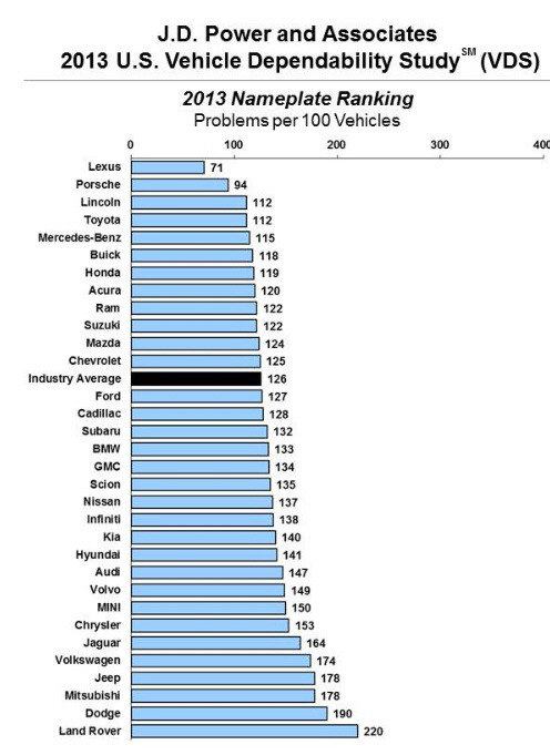 '2013 차량 내구 품질조사(VDS)' 상위 브랜드 10선이다.