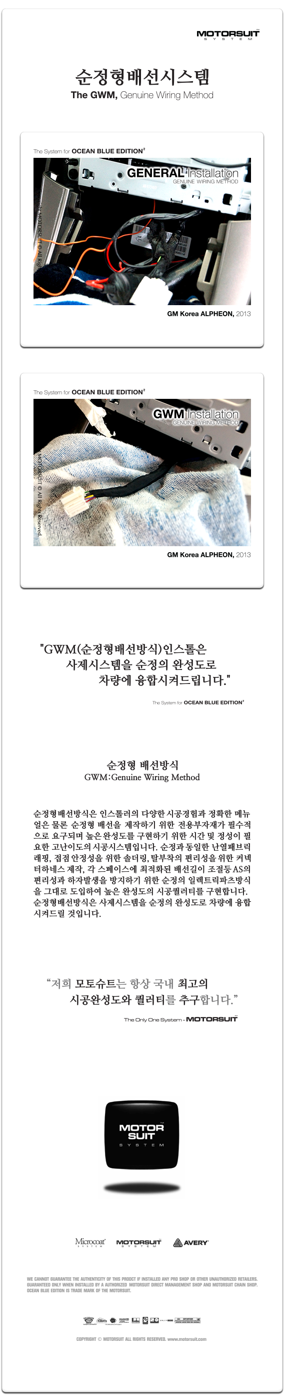 순정과 동일한 난열패브릭 래핑, 접점 안정성을 위한 솔더링, 탈부착의 편리성을 위한 하네스 제작, 각 스페이스에 최적화된 배선길이 조절등 AS의 편리성과 하자발생을 방지하기 위한 순정의 일렉트릭파츠 방식을 그대로 도입하여 높은 완성도의 시공퀄러티를 구현합니다. 순정형배선방식은 사제시스템을 순정의 완성도로 차량에 융합시켜드릴 것입니다.