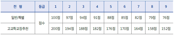 ▶ 과목별 9등급 점수화 : 등급 간 점수차(3점) 적용 * 고교학교장추천 전형 : 등급 간 점수차(6점)
