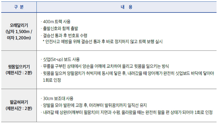 - 윗몸일으키기, 팔굽혀펴기, 미실시자는 해당 종목 0점 처리
