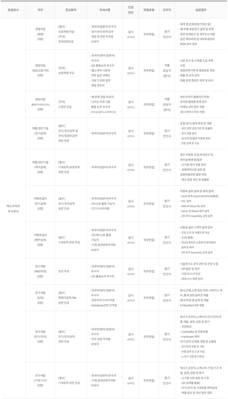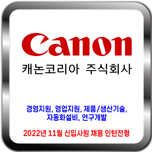 | 접수기간 : 2022. 11. 07(월) ~ 2022. 11. 20(일) 접수방법 : 캐논코리아 채용 홈페이지 지원서 접수 결과발표 : 2022년 11월 넷째주 예정 |