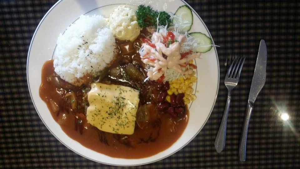 슬라이스 치즈가 떡 하니 누워있는 이것은 함박 스테이크입니다.