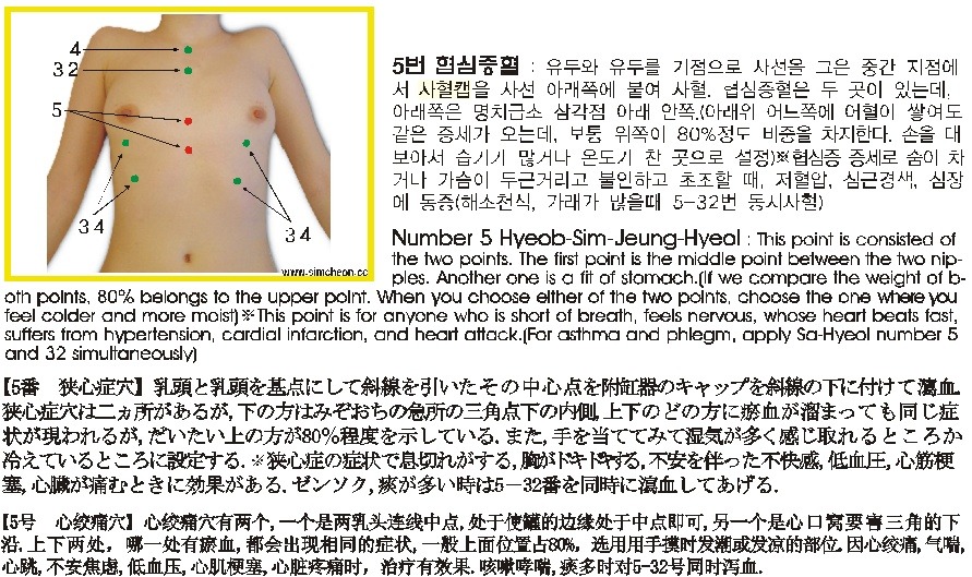 5번 협심증혈은 유두와 유두룰 기점으로 사선을 그은 중간지점에서 사혈컵을 아래쪽에 붙여 사혈.