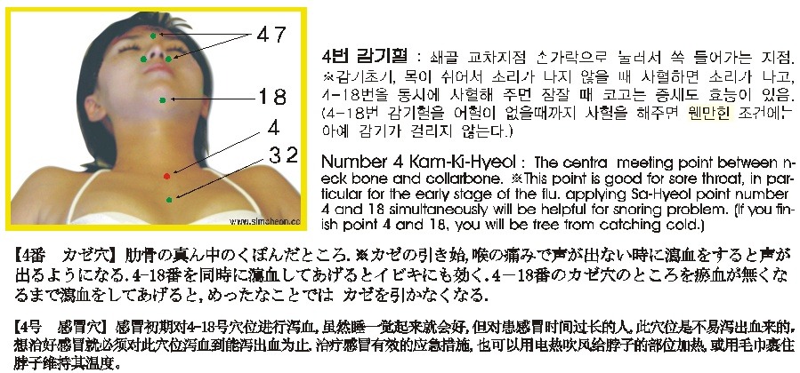감기초기 목이 쉬어서 소리가 나지 않을때 사혈하면 소리가 나고 4, 18번을 동시에 사혈해 주면 잠잘때 코고는 증세도 효능이 있음.
