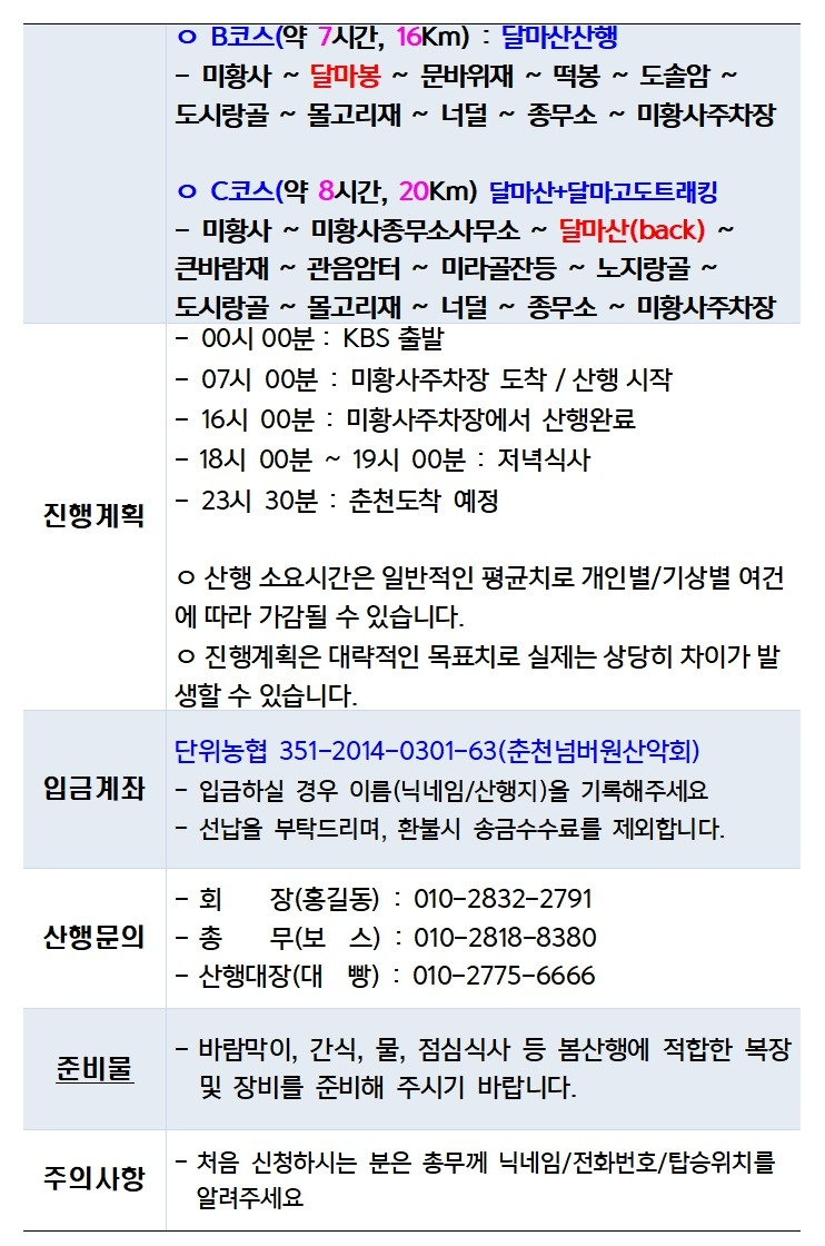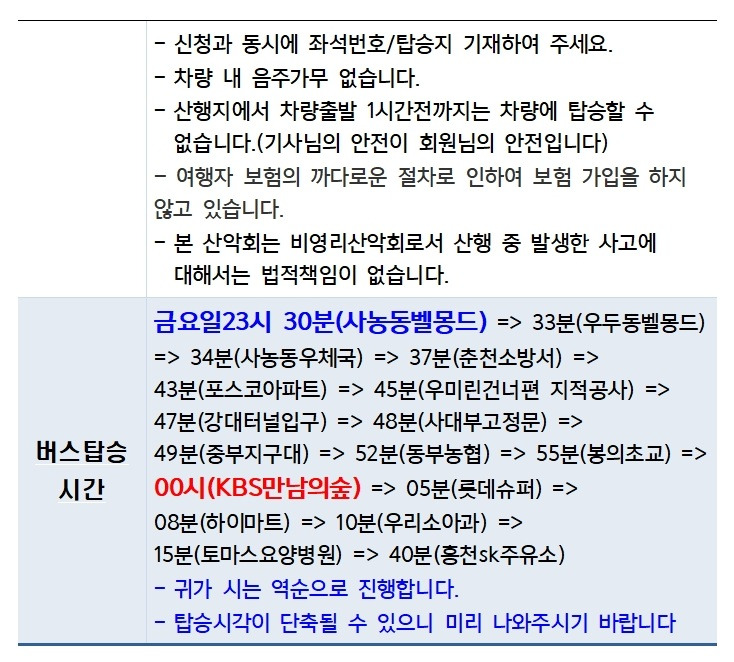 넘버원산악회는 적은 인원으로도 회비가 부족해도 정해진 산행을 진행을 하나, 회원님의 건강이 우선으로 부득이 하게 취소하게 됨을 넓은 마음으로 양해하여 주시기 바랍니다.