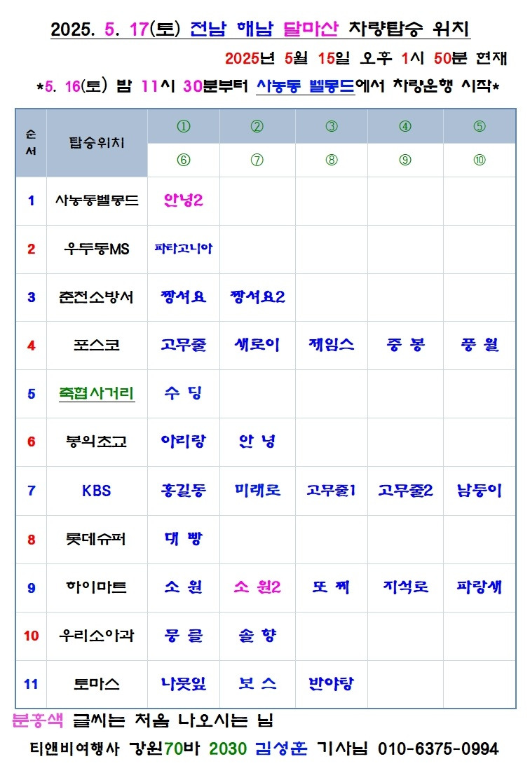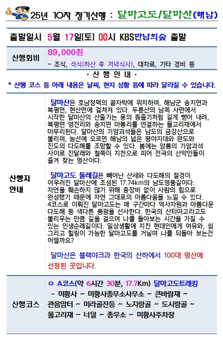 [취소]긴급취소 및 연기-5월 17일(토) "멋진 암릉과 바다풍경과 함께하는 달마산 산행/트래킹, 차량순환 후 오전 0시 KBS 출발