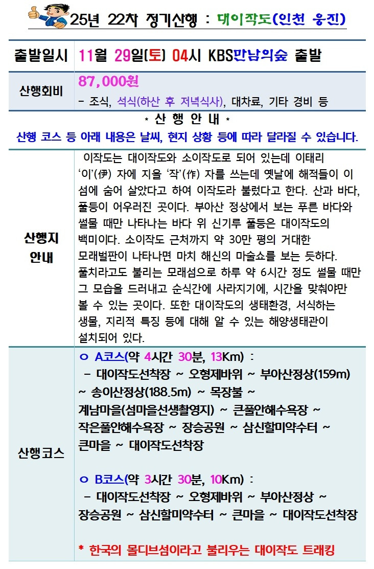 작성자홍길동 작성시간 25.11.21 * 대부해운 인천지점 (032-887-0602) 에 40명 명단 메일 발송~~~ 오전 7시 50분 연안부두터미널 출발~오전 10시 대이작도 도착, 오후 2시 40분 대이작도 출발~오후 5시 연안부두터미널 도착. 1960년 10월 29일 생일기준 이하 26명 이라서 일반 단체 적용... <버스가 40인승으로 바뀌어서 명단 40명으로 조정>