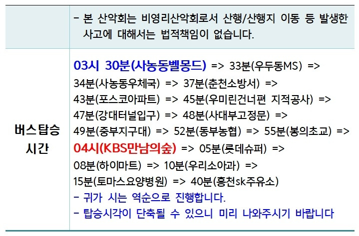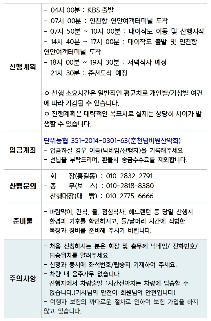 - 처음 오시는 분은 이름, 주민번호 앞 6자리, 성별, 전번을 홍길동회장(010-2832-2791) 에게 톡이나 문자로 알려주세요. 뱃표를 끊어야 합니다.