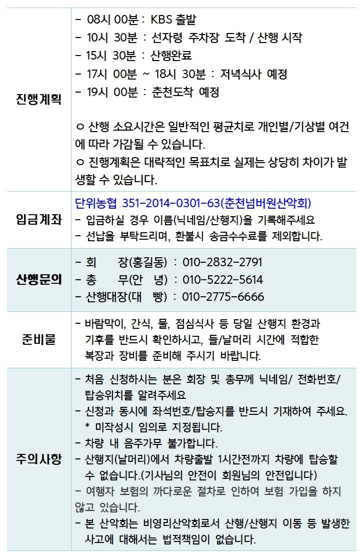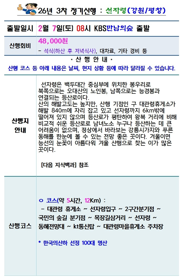 - 선자령 산행은 8시 출발로 아침식사는 제공되지 않습니다.