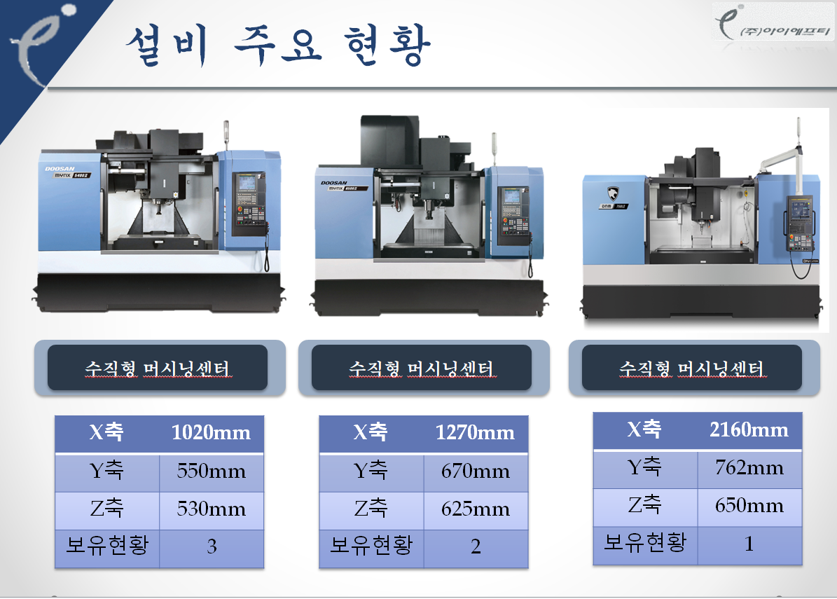머시닝센터 4호기부터 7.5호기 까지 총 9대 , 5축가공기 3대 , CNC(2+1축) 4대 보유 하고있으며