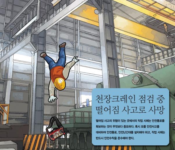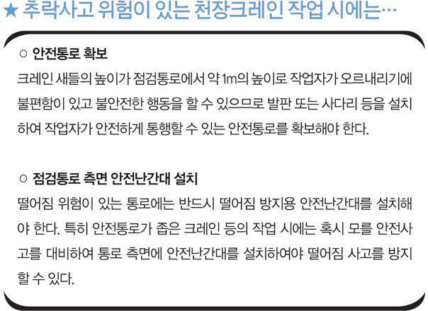 ▲ 산업안전보건기준에 관한 규칙 제23조(가설통로의 구조) 사업주는 가설통로를 설치하는 경우 다음 각 호의 사항을 준수하여야 한다. 1. 견고한 구조로 할 것 2. 경사는 30도 이하로 할 것. 다만, 계단을 설치하거나 높이 2미터 미만의 가설통로로서 튼튼한 손잡이를 설 치한 경우에는 그러하지 아니하다. 3. 경사가 15도를 초과하는 경우에는 미끄러지지 아니하는 구조로 할 것 4. 추락할 위험이 있는 장소에는 안전난간을 설치할 것. 다만, 작업상 부득이한 경우에는 필요한 부분만 임시 로 해체할 수 있다. ▲ 산업안전보건기준에 관한 규칙 제139조(크레인의 수리 등의 작업) ① 사업주는 같은 주행로에 병렬로 설치되어 있는 주행 크레인의 수리·조정 및 점검 등의 작업을 하는 경우, 주행로상이나 그 밖에 주행 크레인이 근로자와 접촉할 우려가 있는 장소에서 작업을 하는 경우 등에 주행 크레인끼리 충돌하거나 주행 크레인이 근로자와 접촉할 위험을 방지하기 위하여 감시인을 두고 주행로상에 스토퍼(stopper)를 설치하는 등 위험 방지 조치를 하여야 한다. ② 사업주는 갠트리 크레인 등과 같이 작업장 바닥에 고정된 레일을 따라 주행하는 크레인의 새들(saddle) 돌출부와 주변 구조물 사이의 안전공간이 40센티미터 이상 되도록 바닥에 표시를 하는 등 안전공간을 확보 하여야 한다. ▲ 산업안전보건기준에 관한 규칙 제144조(건설물 등과의 사이 통로) ① 사업주는 주행 크레인 또는 선회 크레인과 건설물 또는 설비와의 사이에 통로를 설치하는 경우 그 폭을0.6 미터 이상으로 하여야 한다. 다만, 그 통로 중 건설물의 기둥에 접촉하는 부분에 대해서는 0.4미터이상으 로 할 수 있다. ② 사업주는 제1항에 따른 통로 또는 주행궤도 상에서 정비·보수·점검 등의 작업을 하는 경우 그 작업에종사 하는 근로자가 주행하는 크레인에 접촉될 우려가 없도록 크레인의 운전을 정지시키는 등 필요한 안전조치 를 하여야 한다. ▲ 산업안전보건기준에 관한 규칙 제145조(건설물 등의 벽체와 통로의 간격) 사업주는 다음 각 호의 간격을 0.3미터 이하로 하여야 한다. 다만, 근로자가 추락할 위험이 없는 경우에는 그 간격을 0.3미터 이하로 유지하지 아니할 수 있다. 1. 크레인의 운전실 또는 운전대를 통하는 통로의 끝과 건설물 등의 벽체의 간격 2. 크레인 거더(girder)의 통로 끝과 크레인 거더의 간격 3. 크레인 거더의 통로로 통하는 통로의 끝과 건설물 등의 벽체의 간격 ▲ 산업안전보건법 제23조(안전조치) ③ 사업주는 작업 중 근로자가 추락할 위험이 있는 장소, 토사·구축물 등이 붕괴할 우려가 있는 장소, 물체가 떨어지거나 날아올 위험이 있는 장소, 그 밖에 작업 시 천재지변으로 인한 위험이 발생할 우려가 있는장소 에는 그 위험을 방지하기 위하여 필요한 조치를 하여야 한다. ▲ 산업안전보건법 제66조의2(벌칙) 제23조 제3항을 위반하여 근로자를 사망에 이르게 한 자는 7년 이하의 징역 또는 1억원 이하의 벌금에 처한다. 재해예방대책 법령정보 제공 최낙현 노무사(노무법인 노정) 출처 : 안전보건웹진 |