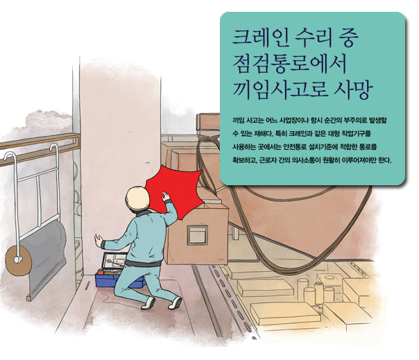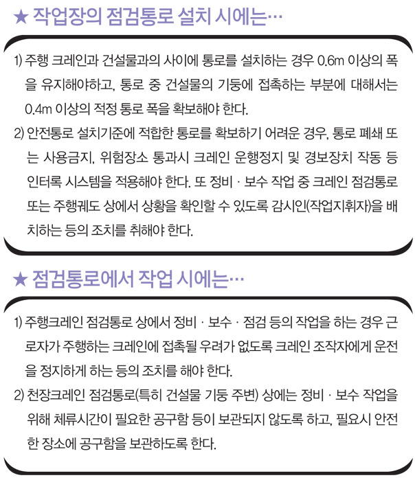 <관련규정> ㅇ건설물 등과의 사이 점검통로 폭 미확보 등 관련규정 : 산업안전보건기준에 관한규칙 제139조, 제144조 산업안전 건법 제23조 제1항, 제66조의2, 제67조 제1호 <주요내용> ▲ 산업안전보건기준에 관한규칙 제139조(크레인의 수리 등의 작업) ① 사업주는 같은 주행로에 병렬로 설치되어 있는 주행 크레인의 수리·조정 및 점검 등의 작업을 하는 경우, 주행로상이나 그 밖에 주행 크레인이 근로자와 접촉할 우려가 있는 장소에서 작업을 하는 경우 등에 주행 크레인끼리 충돌하거나 주행 크레인이 근로자와 접촉할 위험을 방지하기 위하여 감시인을 두고 주행로상 에 스토퍼(stopper)를 설치하는 등 위험 방지 조치를 하여야 한다. ② 사업주는 갠트리 크레인 등과 같이 작업장 바닥에 고정된 레일을 따라 주행하는 크레인의 새들(saddle) 돌출부와 주변 구조물 사이의 안전공간이 40센티미터 이상 되도록 바닥에 표시를 하는 등 안전공간을 확보하여야 한다. ▲ 산업안전보건기준에 관한규칙 제144조(건설물 등과의 사이 통로) ① 사업주는 주행 크레인 또는 선회 크레인과 건설물 또는 설비와의 사이에 통로를 설치하는 경우 그 폭을 0.6m 이상으로 하여야 한다. 다만, 그 통로 중 건설물의 기둥에 접촉하는 부분에 대해서는 0.4m 이상으 로 할 수 있다 ② 사업주는 제1항에 따른 통로 또는 주행궤도 상에서 정비·보수·점검 등의 작업을 하는 경우 그 작업에 종사 하는 근로자가 주행하는 크레인에 접촉될 우려가 없도록 크레인의 운전을 정지시키는 등 필요한 안전 조 치를 하여야 한다. ▲ 산업안전보건법 제23조(안전조치) ① 사업주는 사업을 할 때 다음 각 호의 위험을 방지하기 위하여 필요한 조치를 하여야 한다. 1. 기계·기구, 그 밖의 설비에 의한 위험 ▲ 산업안전보건법 제66조의2(벌칙) 제23조 제1항을 위반하여 근로자를 사망에 이르게 한 자는 7년 이하의 징역 또는 1억원 이하의 벌금에 처한다. ▲ 산업안전보건법 제67조(벌칙) 제1호 제23조 제1항을 위반한 자는 5년 이하의 징역 또는 5천만원이하의 벌금에 처한다 재해예방대책 법령정보 제공 최낙현 노무사(노무법인 노정)