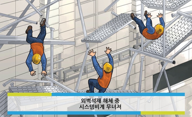 이날 작업자들은 시스템비계 위의 적재된 해체석재를 작업이 끝나면 한꺼번에 운반할 예정이었습니다. 그러나 작업을 용이하게 하려고 했던 안일함으로 인해 작업자 1명이 사망하고 11명이 경중상을 입는 사고를 면할 수 없었습니다.